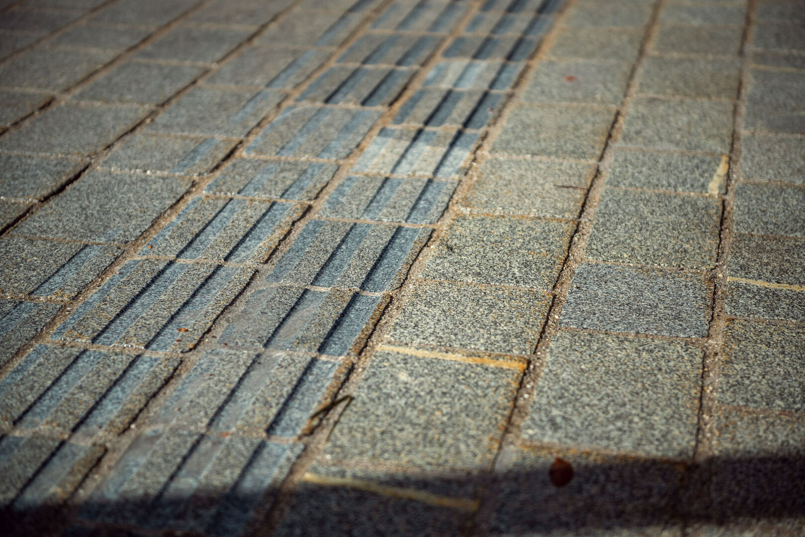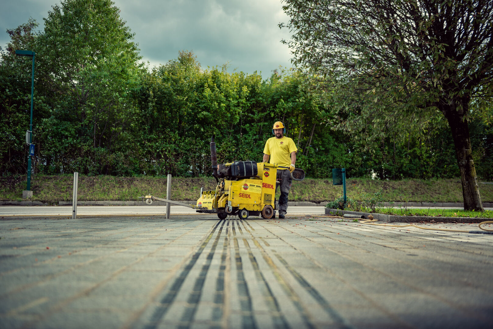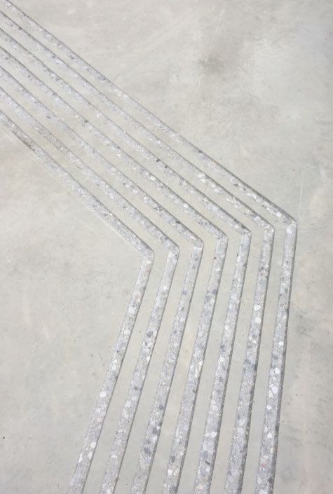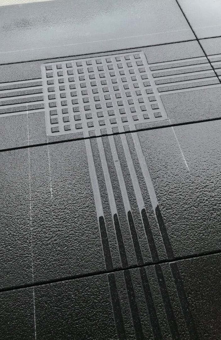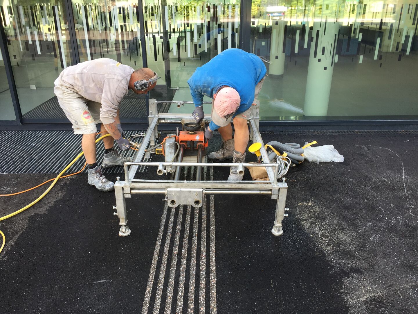 Es wird ein 40 cm breites Blindenleitsystem mit 7 Rillen mit 45 Grad schrägen Flanken mit wassergekühlten Diamantfräsern geschnitten.