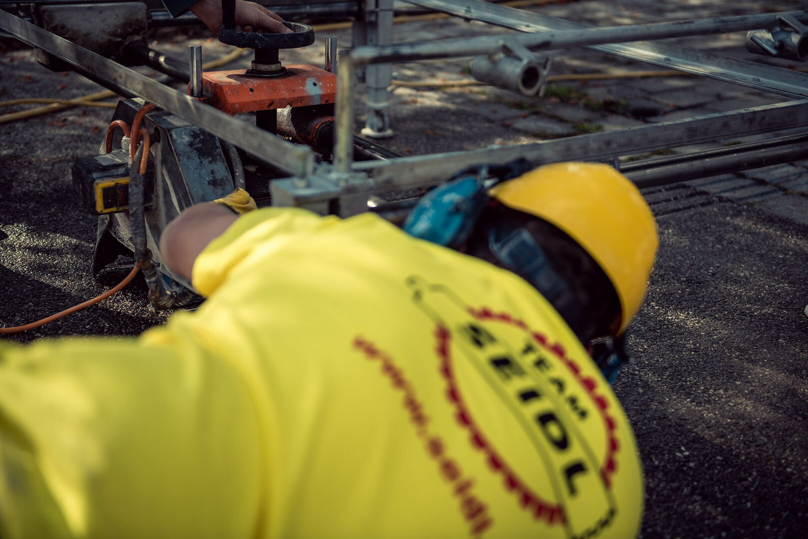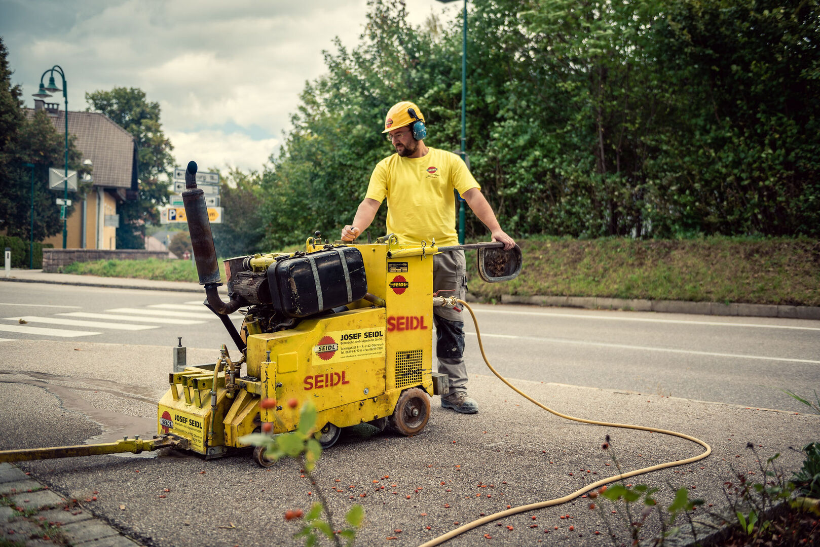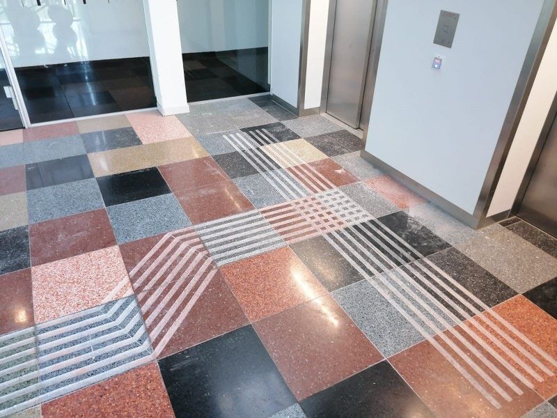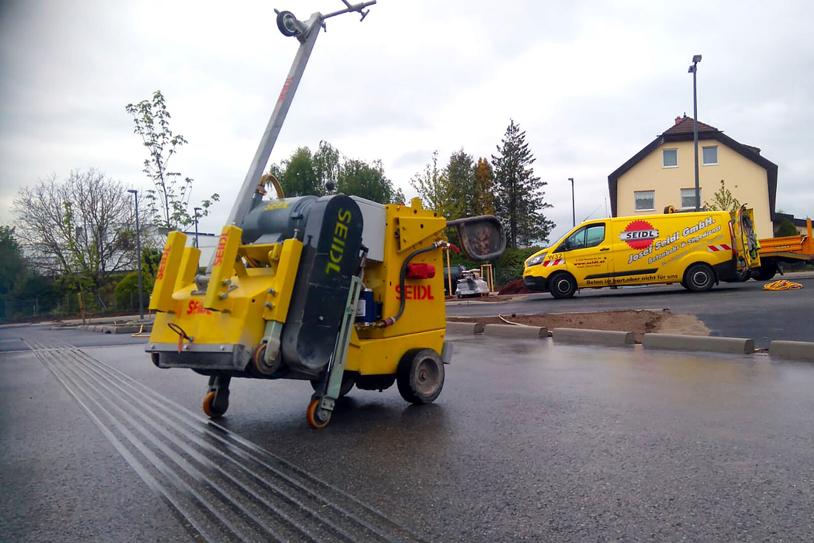 Es wird ein 40 cm breites Blindenleitsystem mit 7 Rillen mit 45 Grad schrägen Flanken mit wassergekühlten Diamantfräsern geschnitten.