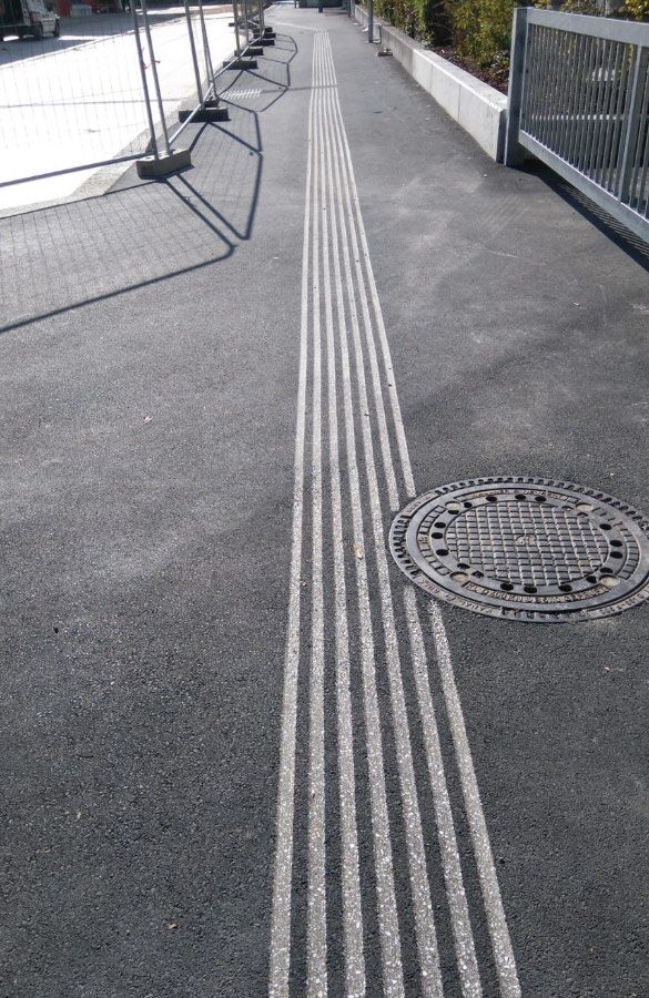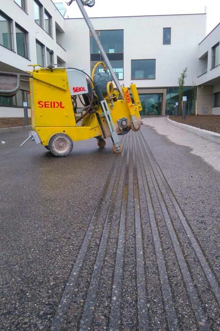 Diese flachen Rillen sind zwischen 5 bis 7 mm tief und somit für den Sehbehinderten gut spürbar, aber für die anderen Straßenbenutzer keine Gefahrenstelle. Der Vorteil dieses nachträglichen Einschneidens eines Blindenleitsystems ist, dass dieses schnell, staubfrei und ohne größere Absperrarbeiten durchgeführt werden kann.